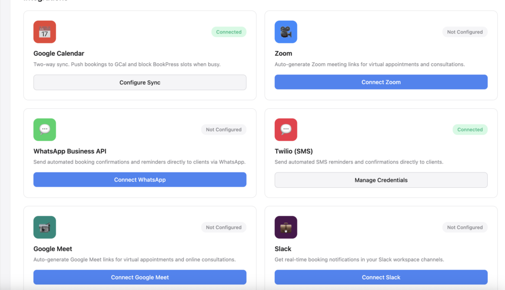 - Flexible Configuration – Business, booking, notification, display settings